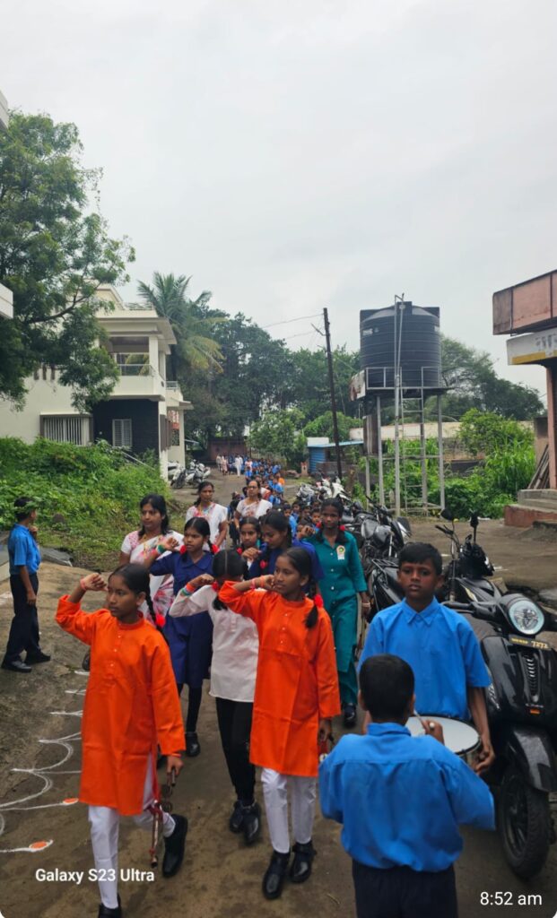 आज सकाळी मोठ्या उत्साही वातावरणामध्ये विद्यार्थी – विद्यार्थिनी प्रभात फेरी काढून गावातील ग्रामस्थांचे लक्ष वेधून घेतले होते . सर्वांनीच भारतीय स्वातंत्र्याच्या घोषणा,पर्यावरणाच्या रक्षणासाठी च्या घोषणा दिल्या.